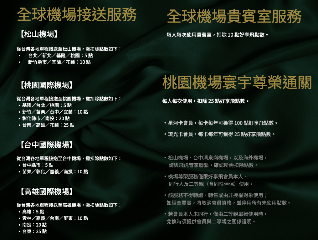- 提供台灣與海外地區機場接送,可使用好享飛點數兌換,便捷、安全、有保障。