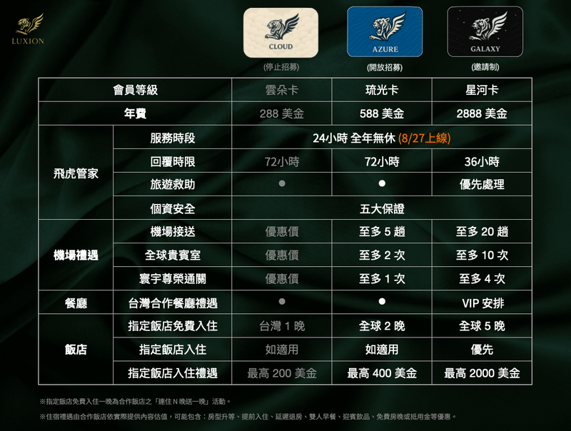 - 合作超過 8,000 間高端飯店,提供每次最高 $2000 美金禮遇、